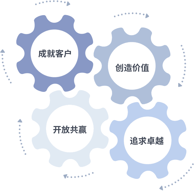 成就客户是一切决策的出发点,,,,创造价值是衡量所有工作的标准,,,追求卓越是龙8做事做人的态度,,,,开放共赢是龙8的格局也是最终的结果。。。。价值观的齿轮环环相扣,,推动着组织里的每个人不断向前。。